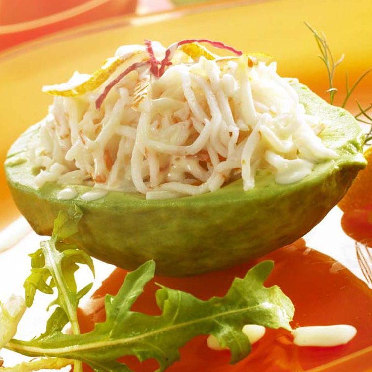 Mezclamos el surimi rallado con mahonesa ligera que prepararemos con antelación o que compraremos ya preparada