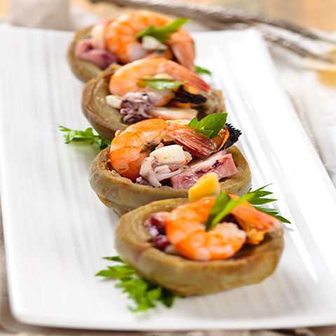 Colocamos las alcachofas en la fuente o plato donde vayamos a servirlas y las rellenamos con pulpo y una gamba