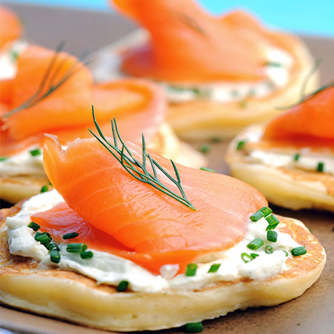 Los colocamos en la bandeja o platos y ponemos en cada uno un poco de queso y una locha no muy grande de salmón ahumado