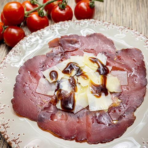 Cortamos la bresaola en lonchas muy finas y las vamos colocando en el plato o la fuente donde vayamos a servirla