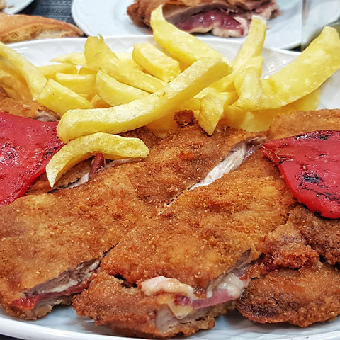 Emplatamos con patatas fritas y unos pimientos del piquillo pasados por la sartén