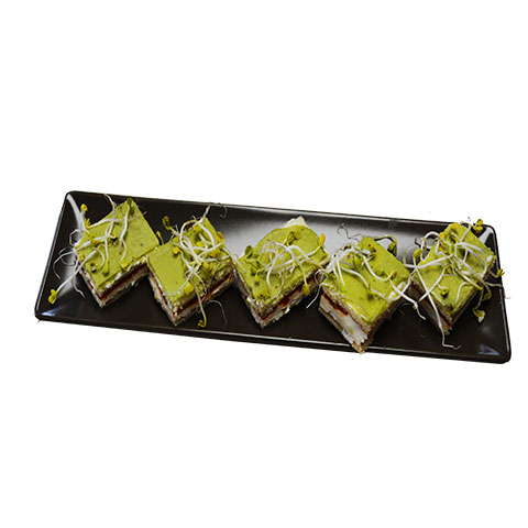 Untamos la segunda capa de bizcocho con la salsa guacamole. Cortamos la plancha en trozos de bocado