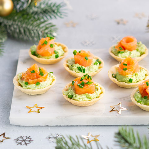 Montar las tartaletas con la base de la mezcla, y encima coronar cada una de ellas con una loncha de salmón ahumado.