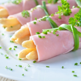 Colocamos encima de cada loncha tres espárragos y formamos un canutillo con cada uno atándolos con una rama de cebollino para que no se abran.