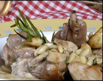 Machaca en un mortero los dientes de ajo, las hojitas de romero, tomillo y perejil. Dilúyelo con el caldo y viertelo en la cazuela con el conejo. Prosigue la cocción hasta que el conejo esté tierno.