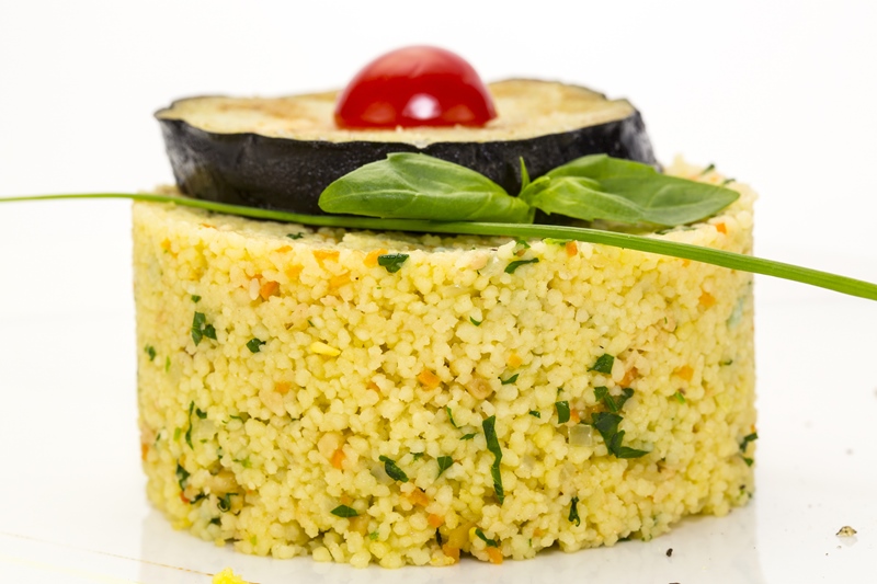 Y para finalizar moldéalo a la hora de servirlo y adórnalo con rodajas de berenjena que has pasado antes por la plancha y tomate cherry partido por la mitad.