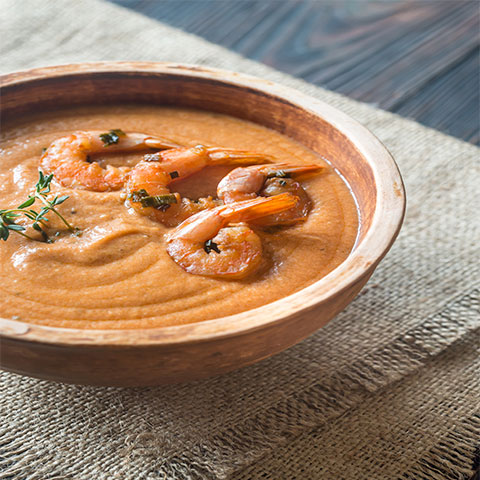 Los cuerpos de los langostinos los utilizamos para decorar los cuencos al servirla