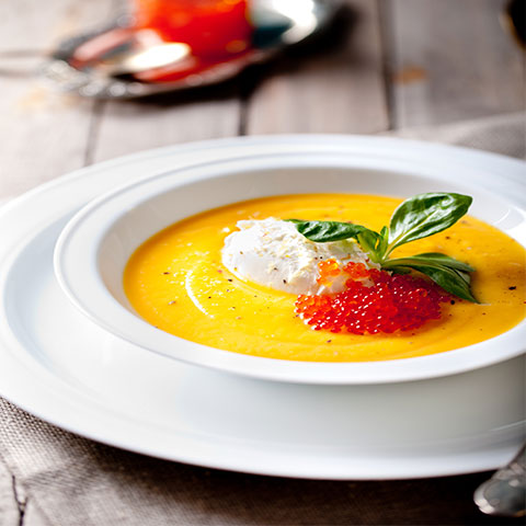 Servimos en los platos con una cucharada de mascarpone y una cucharadita de huevas rojas