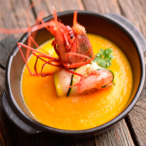 Al servir, decoramos cada cuenco con un carabinero y una tira de calabacín, ambos a la plancha