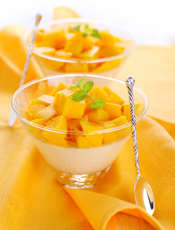 Montar la copa con la cuajada poner los dados de mango por encima.