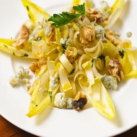 Colocamos las hojas de las endibias en el plato o fuente donde vayamos a servir nuestro entrante