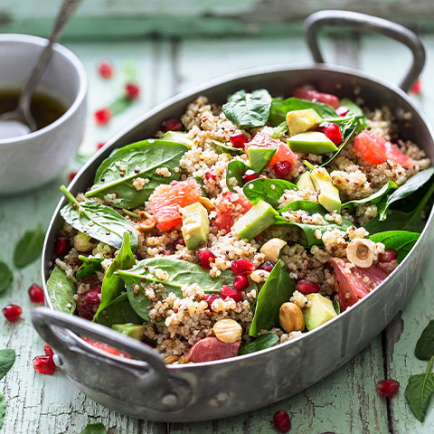Desgranamos la granada y añadimos a la ensaldera, al igual que el aguacate, el pollo , las avellanas y los brotes de espinacas