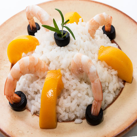 Vamos decorando como véis en la foto, hacemos un flan de arroz y colocamos un langostino con la base de aceituna negra y una rodaja de melocotón alternativamente