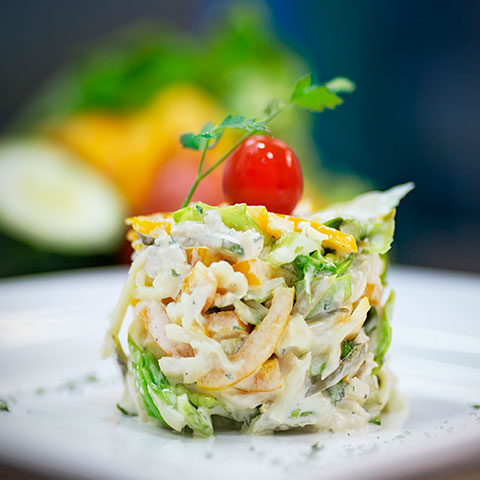 Emplatamos con un molde cilíndrico, rellenamos con nuestra ensalada, ajustamos bien el contenido y ¡listo!