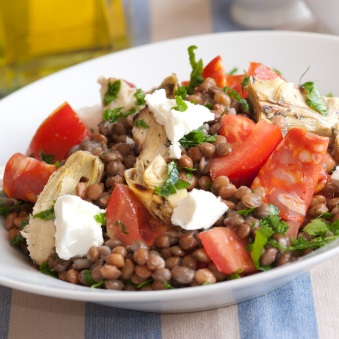 Montamos en un bol la ensalada con las lentejas en la base, luego las alcachofas y el tomate, y decoramos la parte superior con los trozos de queso, el chorizo y la rúcula.