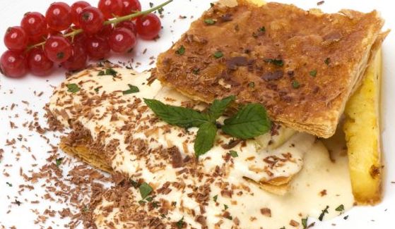 Para servir, alterna capas de hojaldre, de piña y de mousse. Ralla encima el chocolate negro y adorna con unas hojas de menta.