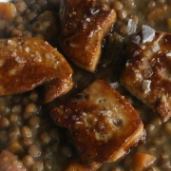 Dorar el foie durante un minuto por cada lado con unas gotas de aceite, ponerlos sobre las lentejas o a un lado, sazonarlo con pimienta y escamas de sal, servir .