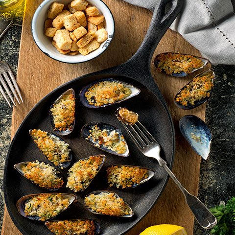 Gratinamos 6 mins y ¡a la mesa en esa misma sartén sobre una tabla de madera!