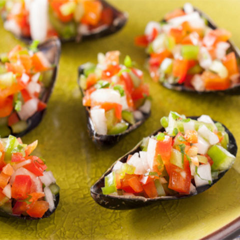 Emplatamos los mejillones retirándoles una concha y colocamos en cada uno la vinagreta