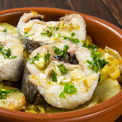 Antes de servir, pochamos unos ajos y los colocamos por encima de la merluza sin el aceite. Decoramos con perejil fresco
