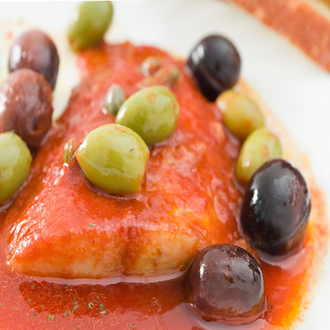 Emplatamos el pescado con nuestra salsa y decoramos con las aceitunas y alguna alcaparra