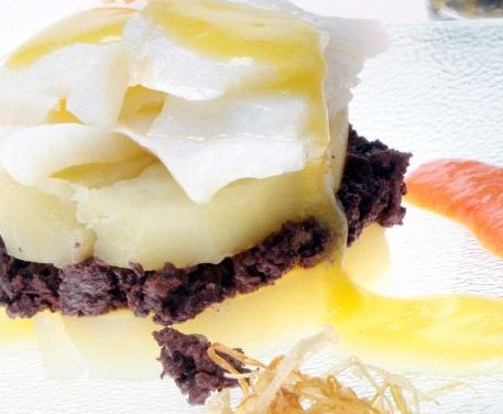 Con la ayuda de un corta pastas, coloca en la base una rodaja de patata, encima una capa de morcilla y pon otras dos capas de cada uno. Repite la operación. Sobre cada montadito coloca un lomo de bacalao.
