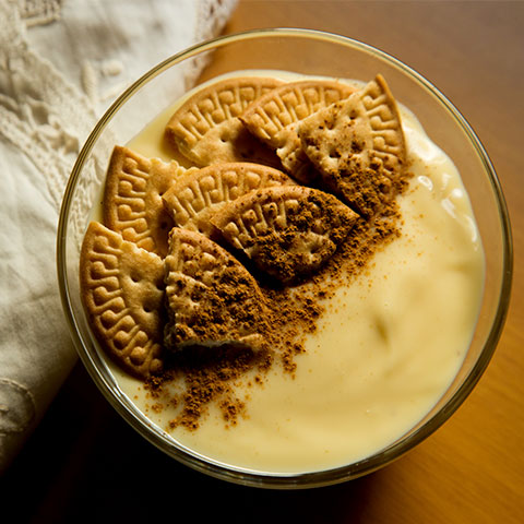 Retiramos del fuego, servimos en los moldes que vayamos a utilizar y colocamos cuatro galletas partidas en cada cuenco