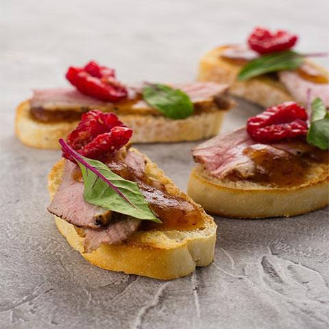 Tostamos las rebanadas de pan y con una cucharita ponemos mermelada, encima dos rodajas superpuestas o una si es grandecita