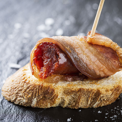 Montamos canutillos con el bacon y la chistorra y los fijamos con un palillo al pan