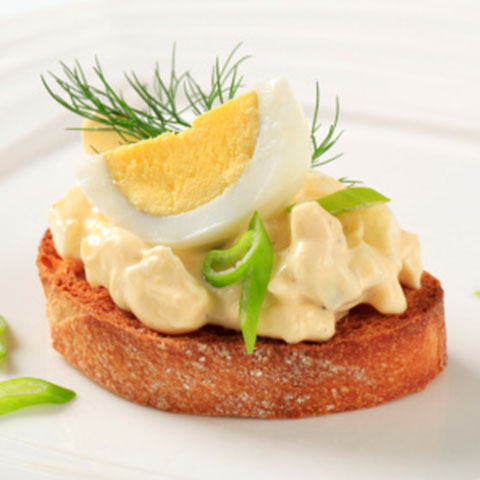 Tostamos el pan y montamos sobre el la mezcla de patatas con la salsa y coronamos con uno de los gajos de huevo. Decoramos con cortes de pimiento.