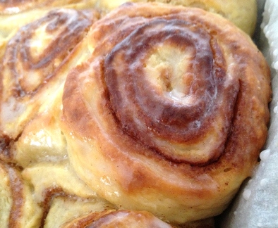 Mezcla el azucar glas con las 2 cucharadas de leche y el zumo de limon, rocia los rollitos y sirvelos