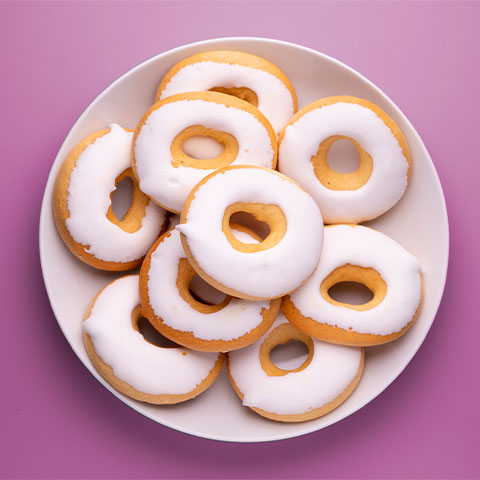Una vez que ya tenemos las rosquillas horneadas y templadas las pintamos con el glaseado. Nosotros les hemos dado dos capas