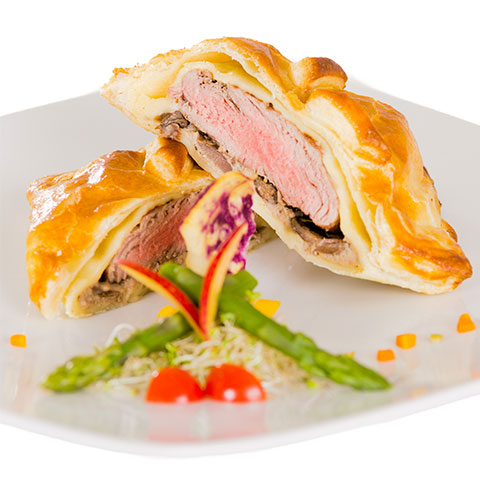 Untamos nuestro solomillo de cerdo fileteado con foie y lo vamos colocando sobre el hojaldre