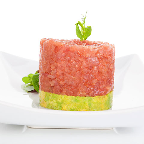 Emplatamos colocando en un molde cilíndrico(si tenemos) la base del aguacate y nuestro atún marinado encima