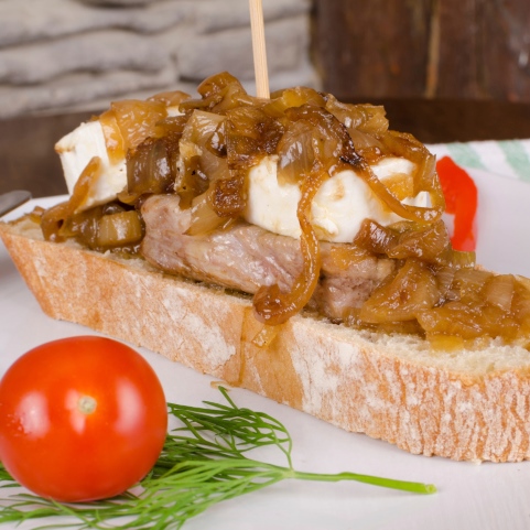 Colocamos el queso encima de la cebolla caramelizada y lo coronamos con un par de palillos.