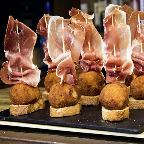 Con un palillo de madera, atravesamos la loncha de jamón serrano y pinchamos la croqueta y la base de pan