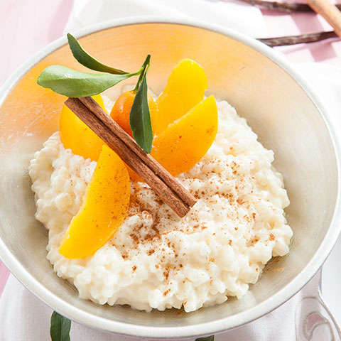 Arroz con leche tradicional preparado con melocotón en almíbar