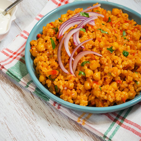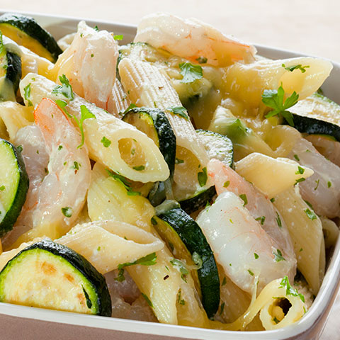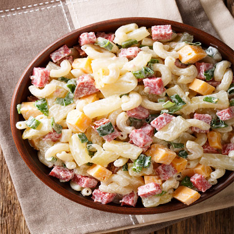 Pasta hervida con trazos pequeños de limon y jamon serrano.